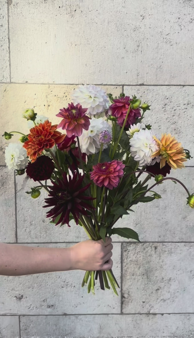 This homegrown bouquet of dahlias bursts with color, blending deep burgundy, fiery orange, sunny yellow, soft pink, and creamy white blooms. The mix of shapes and shades gives it a natural, freshly gathered charm that feels both vibrant and elegant.