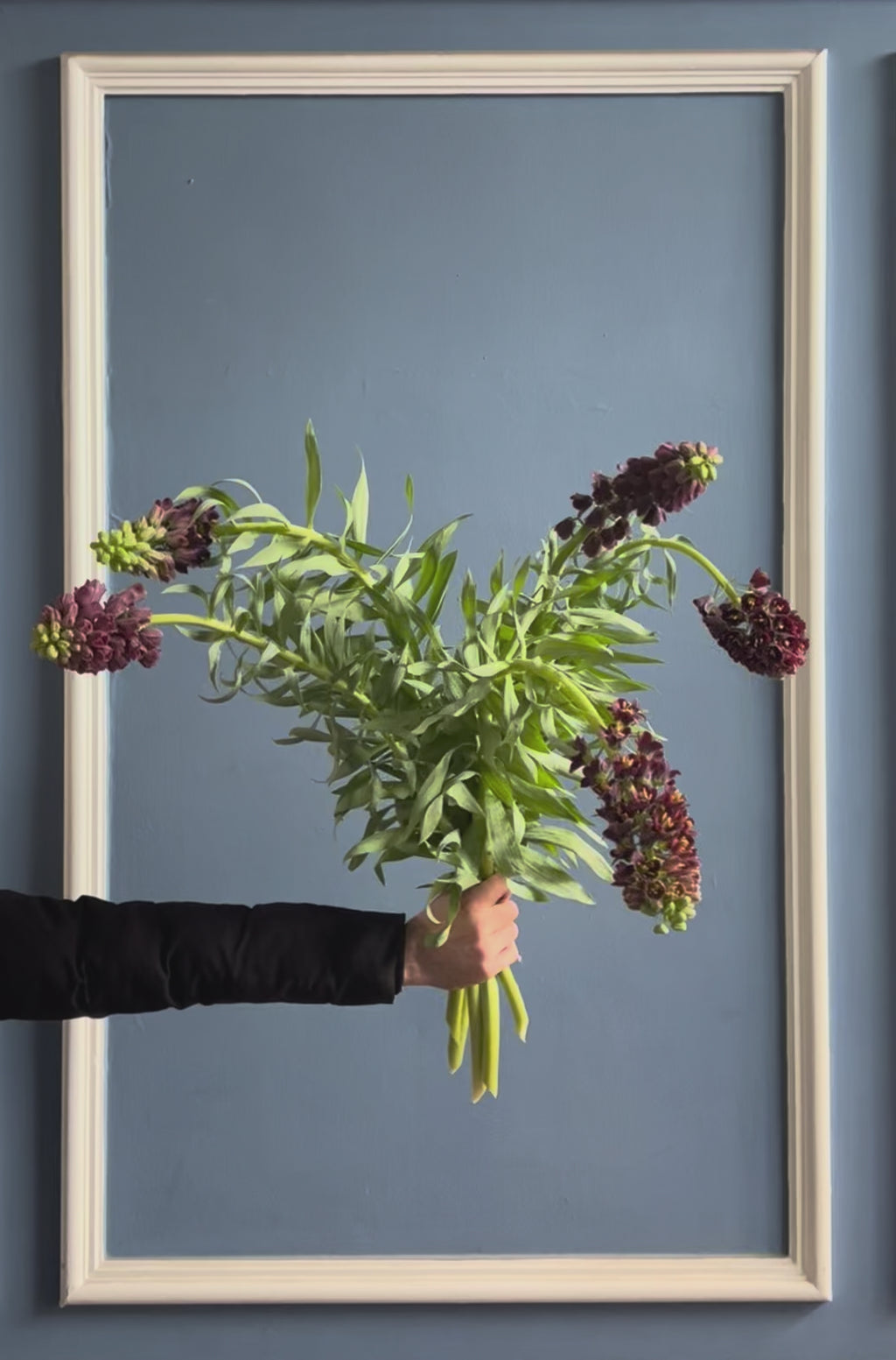 An airy bouquet of deep chocolate and plum-toned Fritillaria is arranged with long, flowing stems and abundant, slender green leaves. The rich, dramatic blooms and loose, organic shape give the bouquet a sculptural, modern elegance.