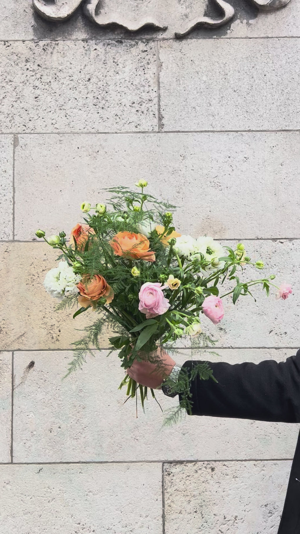 A charming ranunculus bouquet featuring soft peach and blush pink blooms paired with creamy white flowers and airy green foliage. The layered petals and loose, garden-style arrangement give it a romantic, freshly gathered feel.